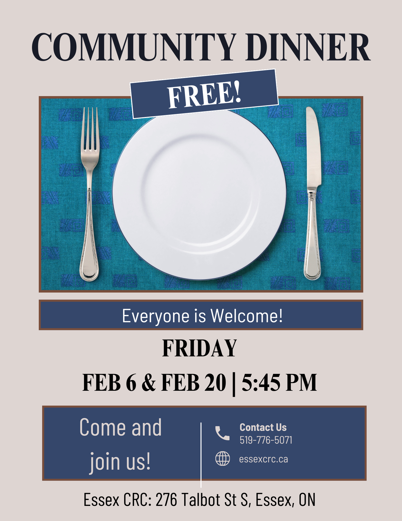 Join us for our Community Dinner at Essex CRC! Everyone is welcome to enjoy a delicious meal, meaningful conversation, and a relaxed evening together. Whether you’re new to the area or a longtime neighbour, this is a wonderful opportunity to connect and share fellowship around the table.