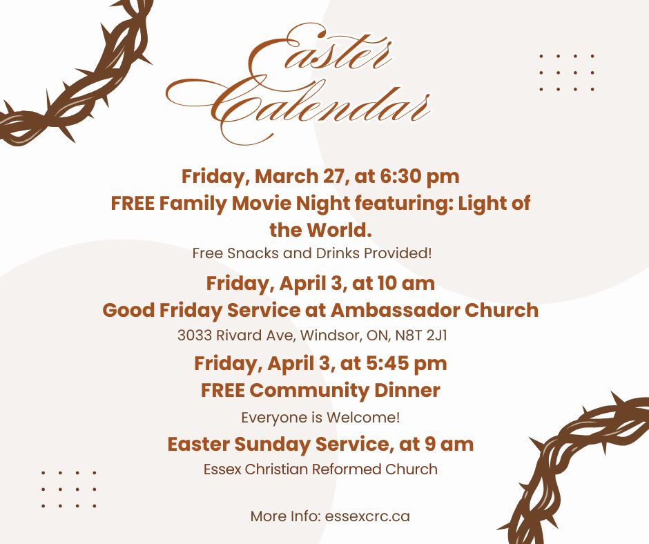 Join us in person or online at the Essex Christian Reformed Church. Our services are held every Sunday at 9am. New Here?Live StreamThank you for visiting!