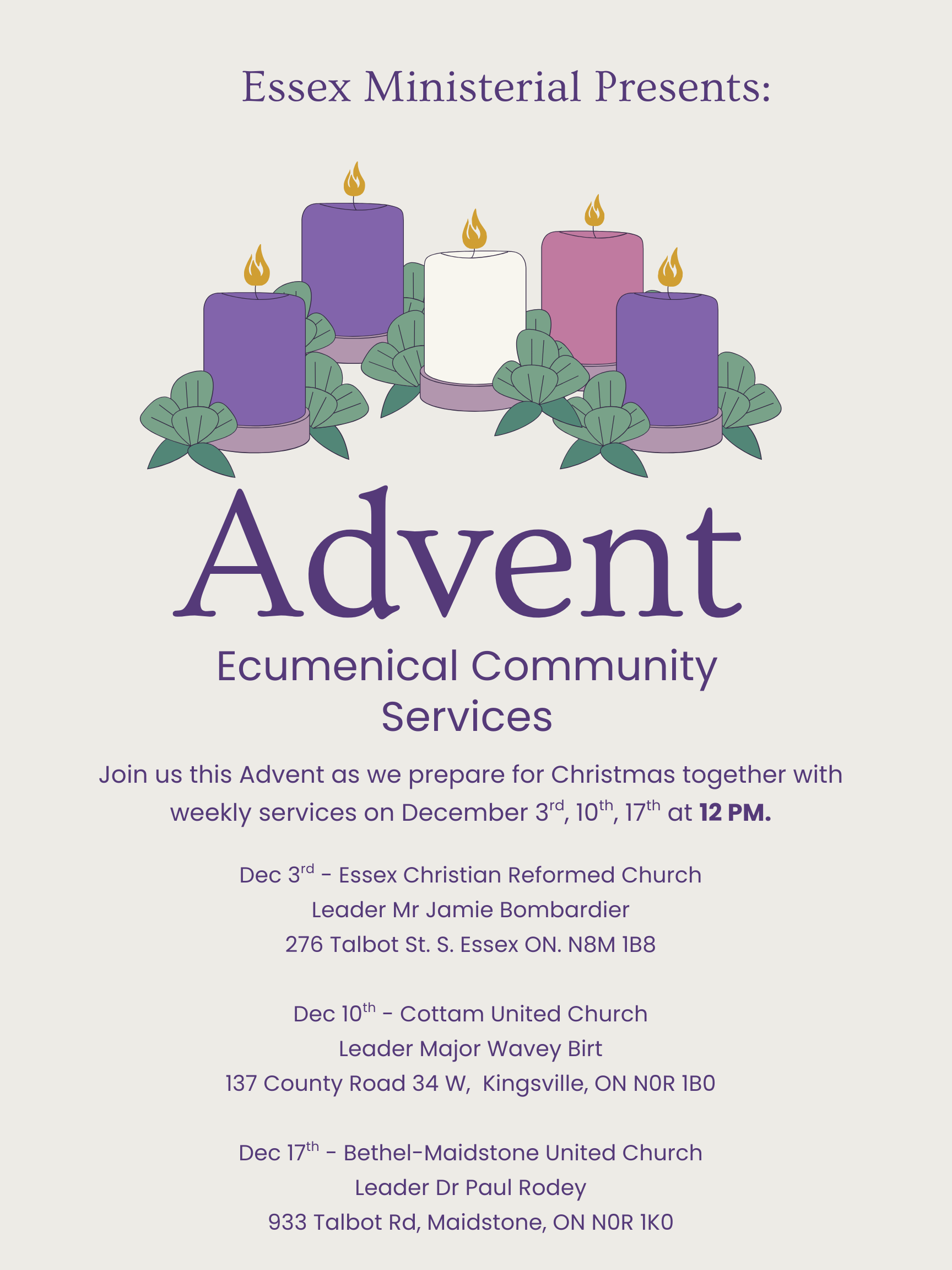 The Essex Ministerial is hosting a series of ecumenical Advent services, and we’re pleased to hold the first one at Essex CRC on Wednesday, Dec 3, at 12 PM.