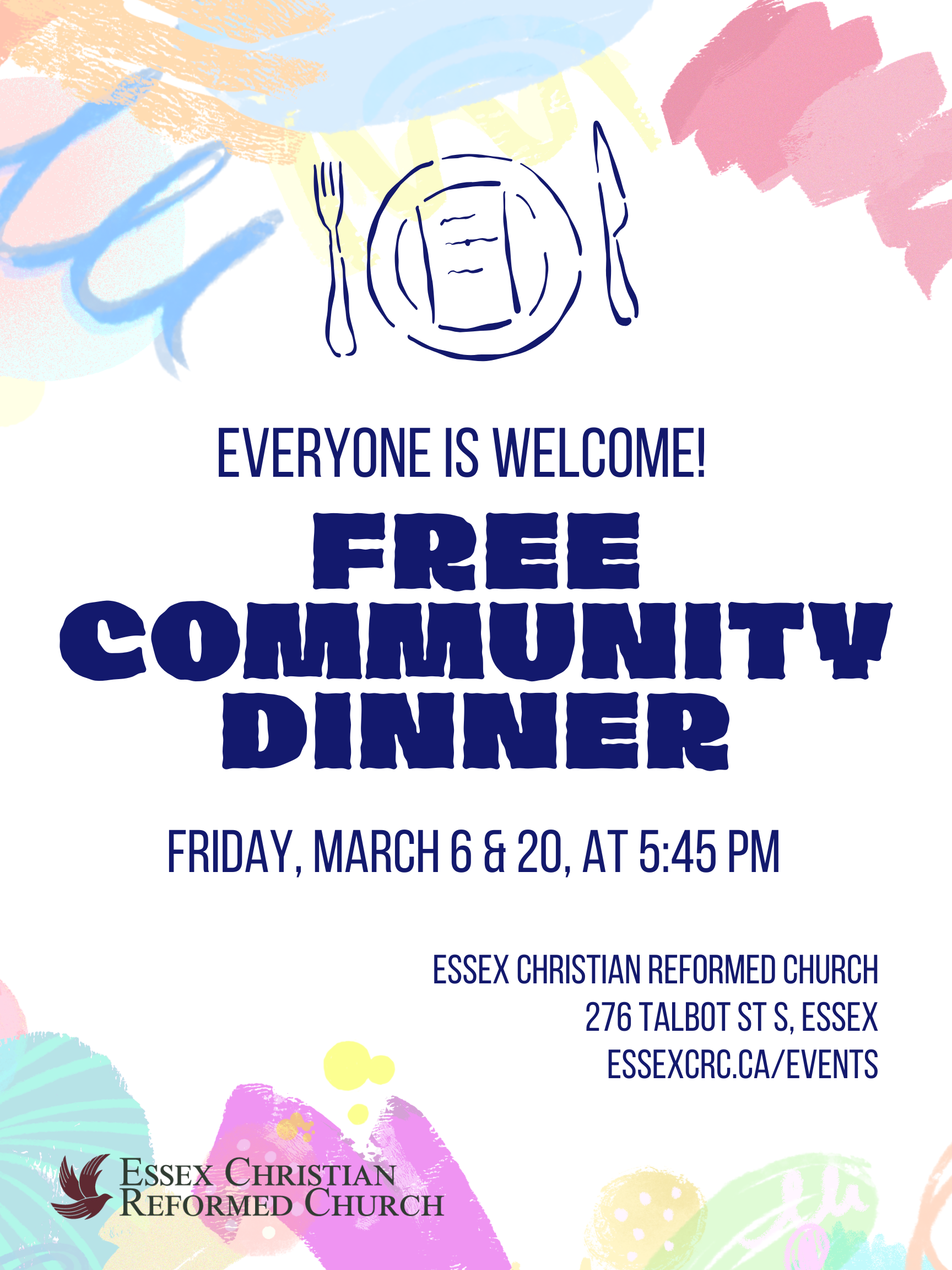 Join us for our Community Dinner at Essex CRC! Everyone is welcome to enjoy a delicious meal, meaningful conversation, and a relaxed evening together. Whether you’re new to the area or a longtime neighbour, this is a wonderful opportunity to connect and share fellowship around the table.